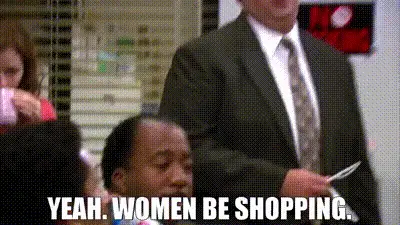 A man from Happy Endings delivers the iconic line, 'Women be shoppin'.' to a woman on a couch.