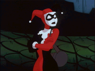 Harley Quinn, the iconic animated character, stands with arms crossed, tongue out, in a dark setting.