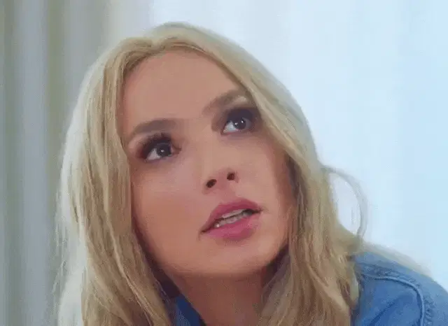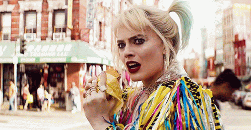 Harley Quinn looks confused while eating a snack on a bustling city street, wearing her iconic colorful jacket.