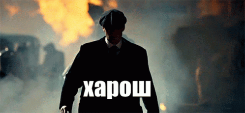 Thomas Shelby walks through smoke with the Russian meme caption 'Harosh' (Good/Well done).