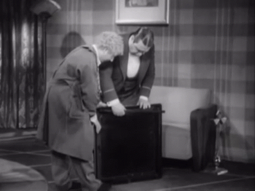Harpo Marx and another man intently examine a suitcase in a room, a classic comedic scene from a Marx Brothers film.
