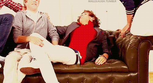 Harry Styles and One Direction members on a leather couch, with Harry leaning back playfully.