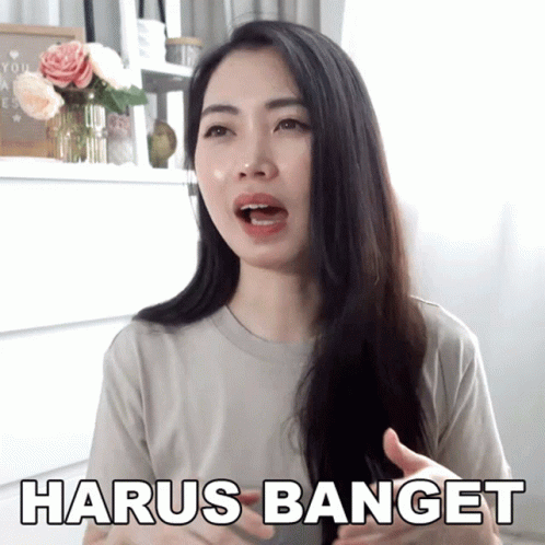 Carysha Sumau says 'Harus Banget' in a video, wearing a grey t-shirt in a room with a dresser.