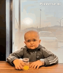a little boy is sitting at a table with a bottle of orange juice in front of a window .
