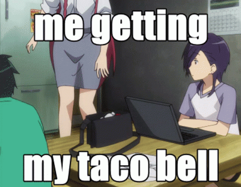 Emilia from Hataraku Maousama is seen getting her Taco Bell, a relatable anime meme moment.