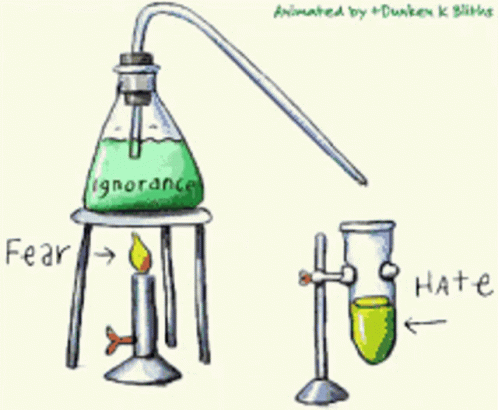 Cartoon illustrating how ignorance, fueled by fear, produces hate in a chemical reaction setup.