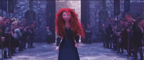 Merida from Brave confidently struts through a castle hall, embodying the 'Haters Gonna Hate' attitude with her iconic red hair.