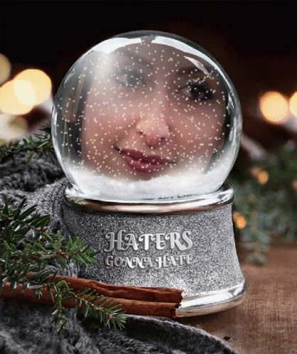 Akiko Shikata's face captured inside a 'Haters Gonna Hate' snow globe, surrounded by winter decor.