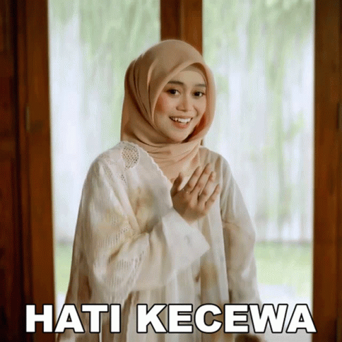 Lesti expresses emotion with 'Hati Kecewa' while wearing a hijab, standing by a window.