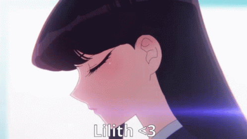 Lilith Komi from Hatred Hangout blushes in a close-up, with 'Lilith <3' text and cherry blossoms.