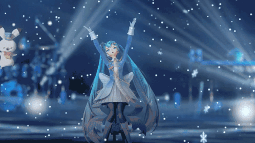 Hatsune Miku figurine dancing gracefully in a snowy, starry setting with a cute white bunny companion.