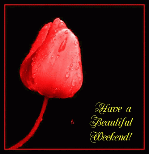 A vibrant tulip changes colors from red to blue to yellow, adorned with water droplets, wishing a beautiful weekend.