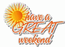 Animated graphic wishing viewers 'Have a great weekend!' with a bright yellow sun in the background.