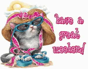 A cute, sparkling kitten wearing sunglasses and a party hat, wishing everyone to 'Have A Great Weekend'.