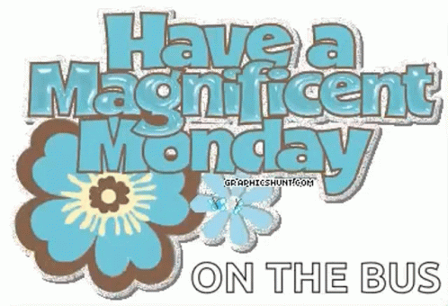 A cheerful graphic wishing 'Have a Magnificent Monday' with blue flowers and the text 'ON THE BUS'.