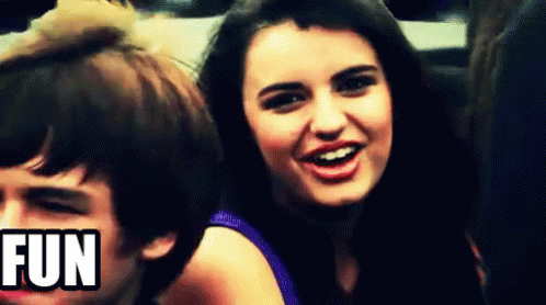 Rebecca Black smiles brightly next to a boy, with the word 'FUN' displayed on screen, capturing a moment of enjoyment.
