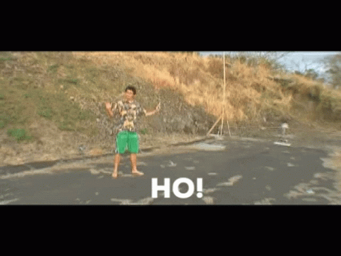 Man in Hawaiian shirt on a road, exclaiming 'Ho!' and 'Shoooots' in Hawaii Pidgin.