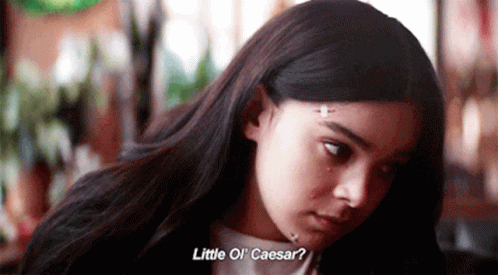 Kate Bishop, played by Hailee Steinfeld, asks 'Little Ol' Caesar?' with a bandage on her forehead in the Hawkeye series.