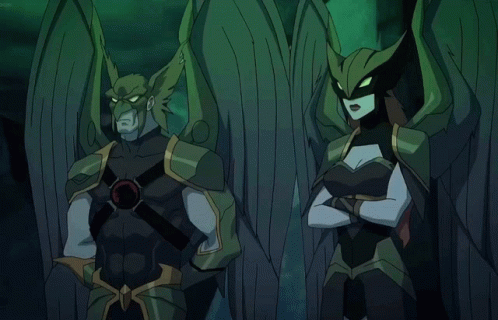 Hawkman and Hawkwoman, the winged heroes from Young Justice, stand side-by-side in their iconic green armor.