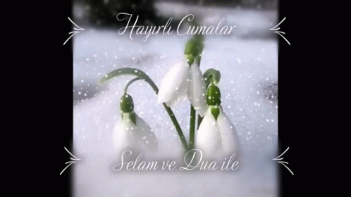 Beautiful snowdrop flowers emerge from the snow, accompanied by the Turkish greeting 'Hayırlı Cumalar Selam Ve Dua Ile'.