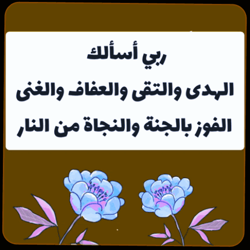 A beautiful Arabic prayer for guidance, piety, chastity, and wealth, set against a backdrop of elegant blue flowers.