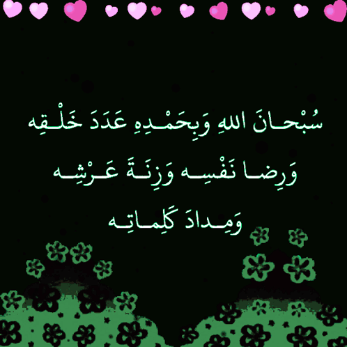 A beautiful Arabic supplication, 'Glory be to Allah...', with pink hearts and green floral designs on a black background.