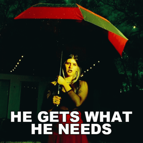 Gatlin stands under a red and black umbrella in the dark, with the caption 'He Gets What He Needs' displayed.