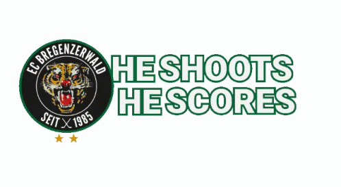 Animated logo for EC Bregenzerwald, featuring 'He Shoots He Scores' and a tiger mascot.