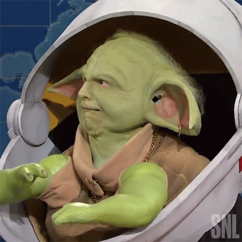 Kyle Mooney as Baby Yoda shaking his head in disagreement during a comedic segment on Saturday Night Live's Weekend Update.