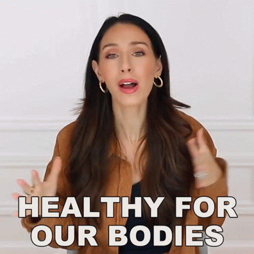 Shea Whitney explains what is healthy for our bodies, gesturing with her hands.