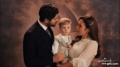 Lucas, Elizabeth, and Little Jack pose for a heartwarming family photo from When Calls The Heart.