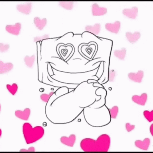 Adorable cartoon character with heart-shaped eyes and a big smile, surrounded by floating pink hearts.