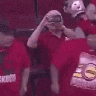 Fans in red shirts, some with 'Rockets' logo, taking photos and dancing at an event.
