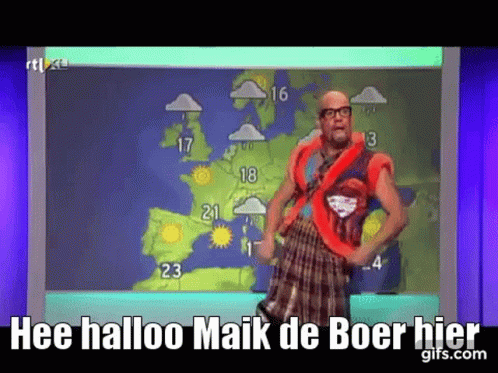 Maik de Boer, in a distinctive outfit, presents the weather report on Tv Kantine with the text 'Hee halloo Maik de Boer hier'.