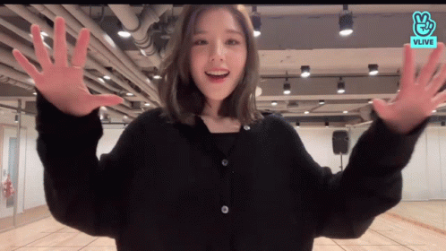 Heejin performs an energetic dab during a V Live broadcast, smiling brightly.