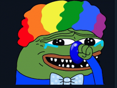 Heh Mda, a clown version of Pepe the Frog, cries while holding a color-changing clown nose.