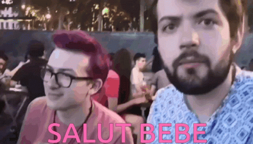 Two men with 'Salut Bebe' text overlay, one with purple hair and glasses, the other bearded.