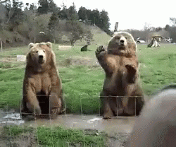 Two brown bears stand on their hind legs, one appearing to wave hello to a person behind a fence.