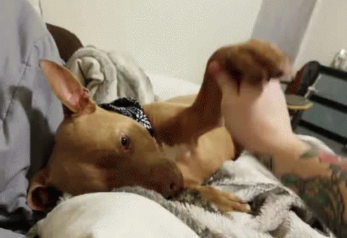 A cute pitbull mix dog lies on its back, playfully pawing at a person's hand on a bed.