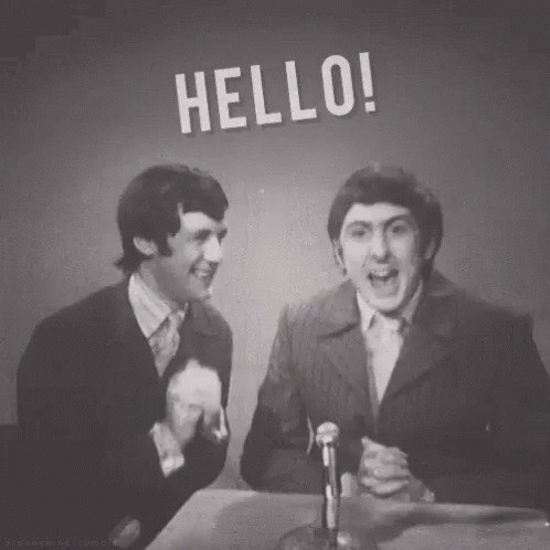 Two men from Monty Python greet the audience with a cheerful 'Hello!' in this classic black and white clip.