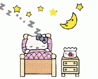 Hello Kitty sleeps soundly in her bed, surrounded by stars and a crescent moon, with a nightstand nearby.