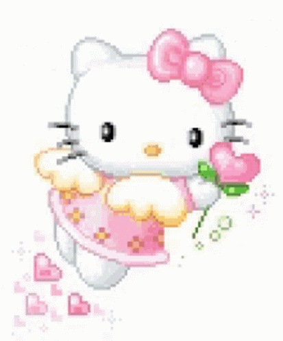 Hello Kitty in a pink dress, holding a heart-shaped flower, surrounded by floating hearts and sparkles.