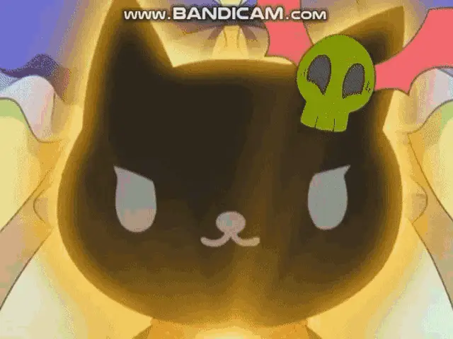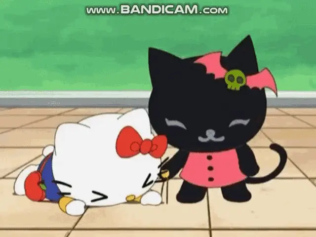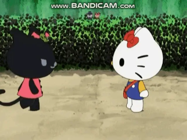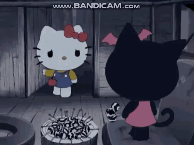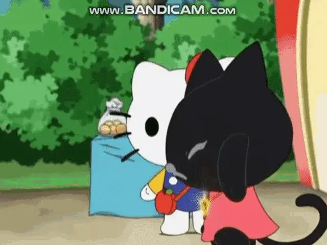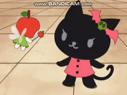 Akuro, the black cat from Hello Kitty's Apple Forest Fantasy, stands with a fairy holding a red apple.