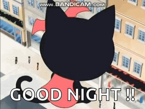 Akuro from Hello Kitty The Fantasy Of The Apple Forest waves and says 'Good Night!!' from above a city.