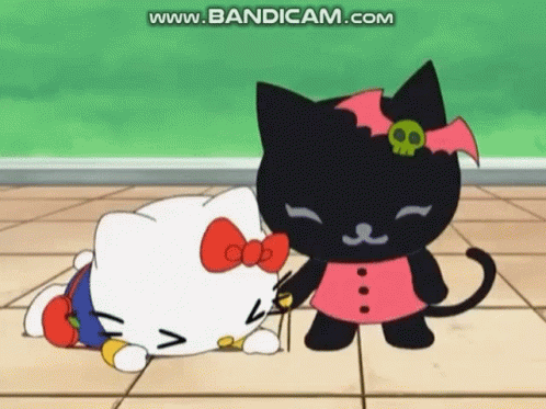 Hello Kitty is on the floor, and Akuro, a black cat with a bat accessory, glows and helps her.