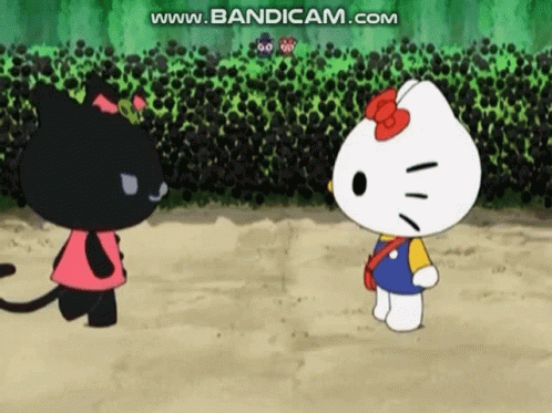 Hello Kitty and Akuro meet in The Fantasy Of The Apple Forest, with Akuro giving a gift to Hello Kitty.