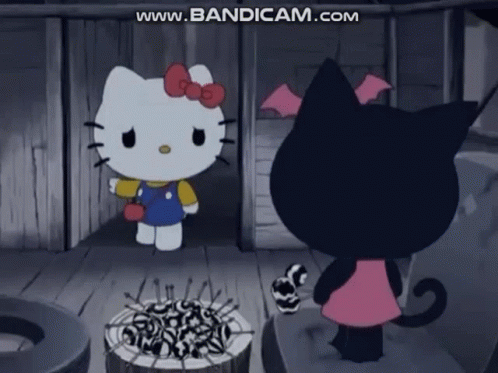 Hello Kitty and Akuro Kitty stand in a dark, mysterious room from The Fantasy Of The Apple Forest.