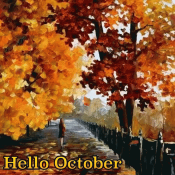 A beautiful painting of an autumn scene with colorful leaves and the text 'Hello October'.