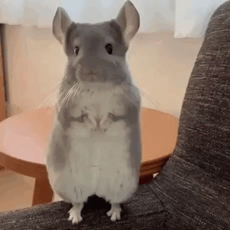 Adorable chinchilla stands on hind legs on a couch, looking at the camera with perked ears.