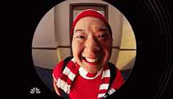 Ken Jeong, dressed in a red and white outfit, waves enthusiastically through a peephole.